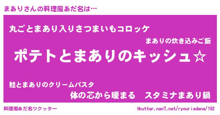| 女子向けラノベタイトル風あだ名 | 『まありの卵を拾いまして』 |