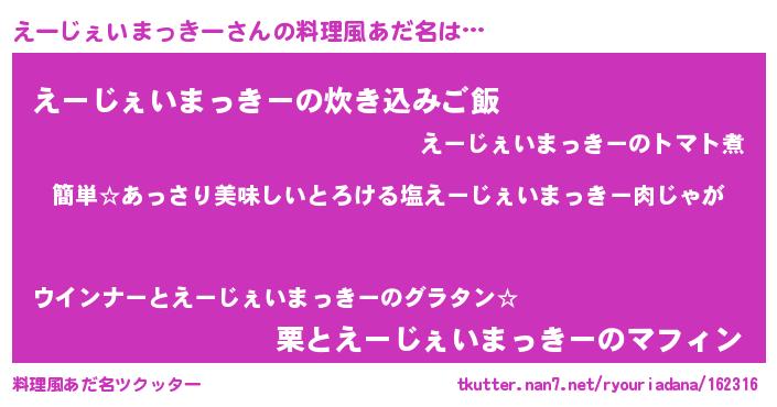 | ヘコむあだ名 | 『えーじぇいまっきー(震え声)』『なまこ酢』 |