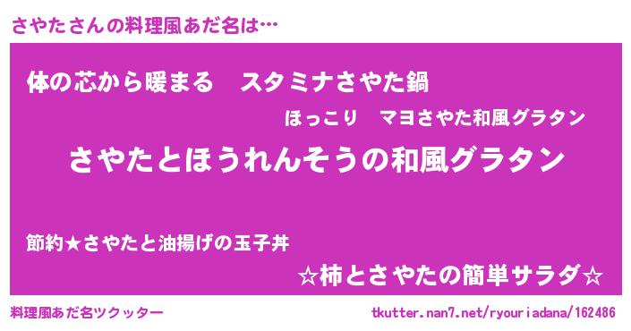 | 男性向けラノベタイトル風あだ名 | 『さやた~年齢イコール彼女いない歴の魔法使い~』 |
