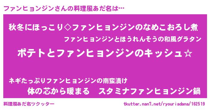 | ポケモン風あだ名 | 『ヒファンヒョンジン』『ファゴンZ』 |
