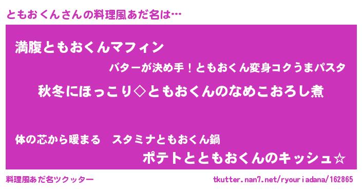 | 男性向けラノベタイトル風あだ名 | 『ともおくんに滅ぼされるだけの簡単なお仕事です』 |