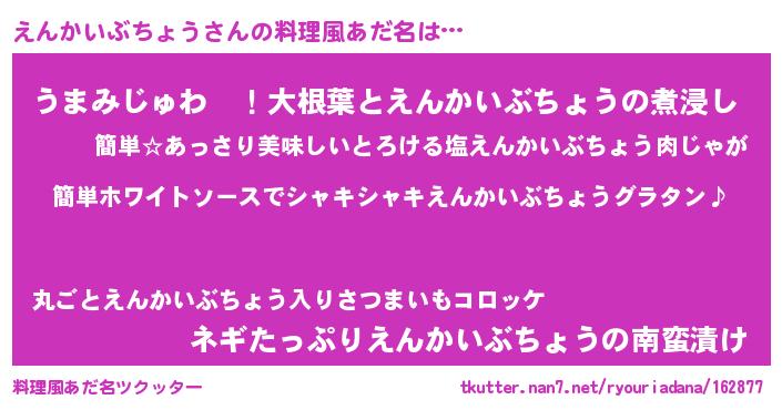 | 男性向けラノベタイトル風あだ名 | 『えんかいぶちょうの嫁は女の子じゃないと思った?』 |