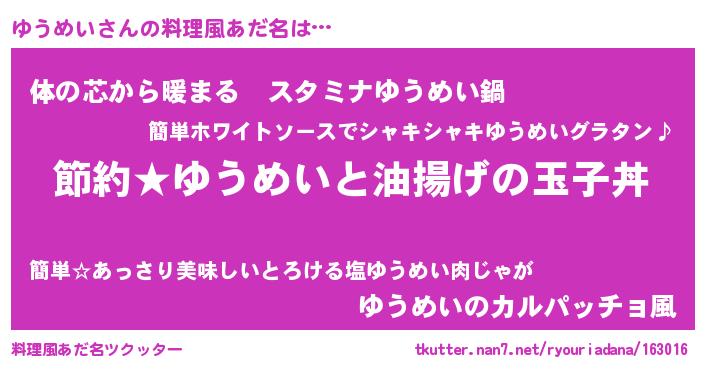 | ピコ太郎風あだ名 | 『ユコ二郎』『ピユ六郎』『ユウ四郎』 |