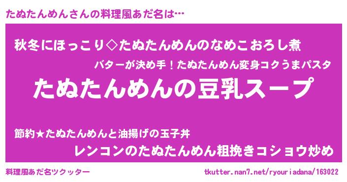 | 男性向けラノベタイトル風あだ名 | 『ダンジョンにたぬたんめんを求めるのは間違っているだろうか』 |