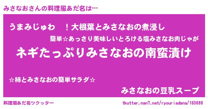 | 胡散臭い通販商品みたいなあだ名 | 『億万長者になれるブレスレット…その名も「みさなお」』 |