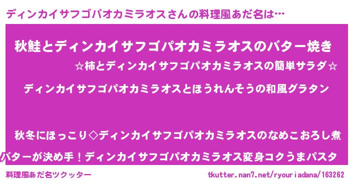 | 男性向けラノベタイトル風あだ名 | 『ディンカイサフゴパオカミラオス~年齢イコール彼女いない歴の魔法使い~』 |