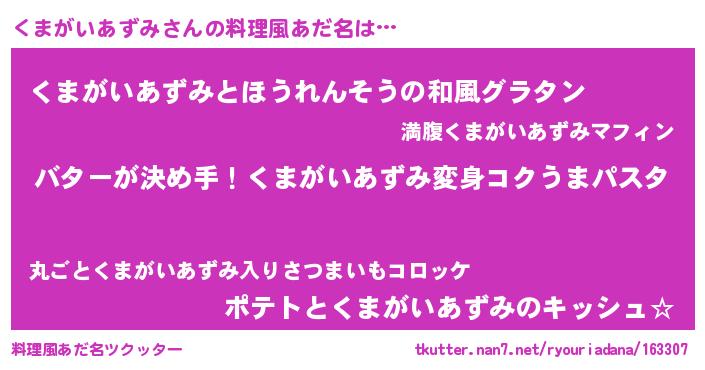 | ヘコむあだ名 | 『くまっぺ』『くまがいあずみ(苦笑)』 |