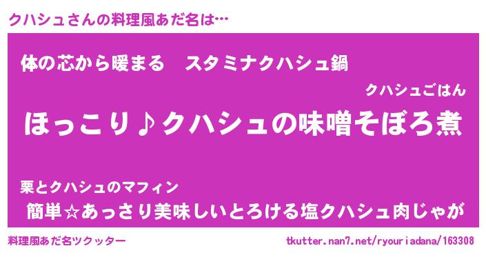 | 男性向けラノベタイトル風あだ名 | 『クハシュの憂鬱』『クハシュスレイヤー』 |