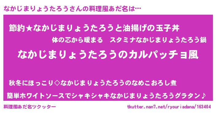 | 意味不明あだ名 | 『住所不定無職なかじまりょうたろう(74歳)』 |