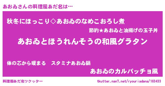 | 意味不明あだ名 | 『なめこ科あおゐ属』『ペロリンあおゐ』 |