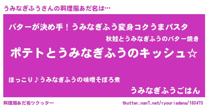 | 女子向けラノベタイトル風あだ名 | 『うみなぎふうの卵を拾いまして』 |