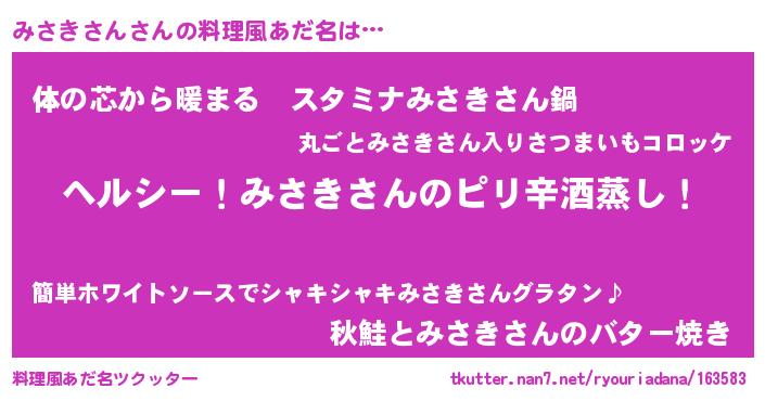 | 男性向けラノベタイトル風あだ名 | 『Re:みさきさんから始める異世界生活』 |