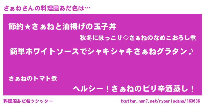 | 男性向けラノベタイトル風あだ名 | 『さぁねの嫁は女の子じゃないと思った?』 |