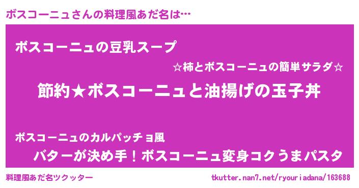 | ヒーロー風カッコイイあだ名 | 『スーパーボスコーニュ』『暗黒騎士ボス』 |