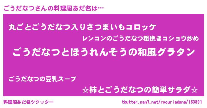 | 胡散臭い通販商品みたいなあだ名 | 『あなたにだけ特別に提供する限定10本のレアな日本酒…その名も「ごうだなつ」』 |