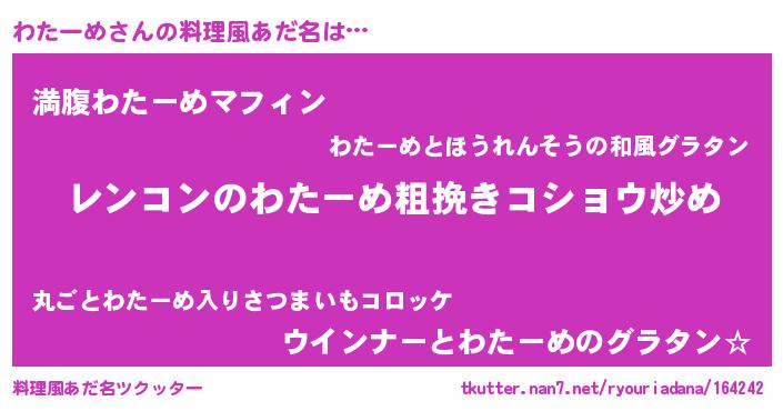 | 意味不明あだ名 | 『自称わたーめ』『永久保存わたーめ』 |