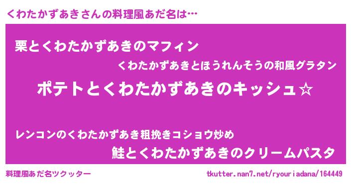 | 女子向けラノベタイトル風あだ名 | 『くわたかずあきの卵を拾いまして』 |