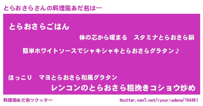 | 男性向けラノベタイトル風あだ名 | 『とらおさらの嫁は女の子じゃないと思った?』 |