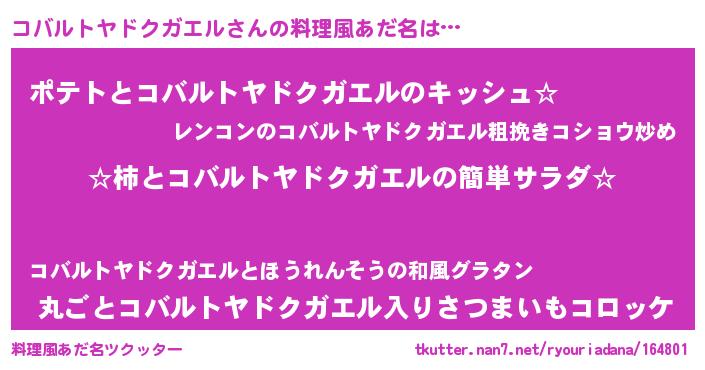 | 胡散臭い通販商品みたいなあだ名 | 『信頼と実績のサプリメント…その名も「コバルトヤドクガエル」』 |
