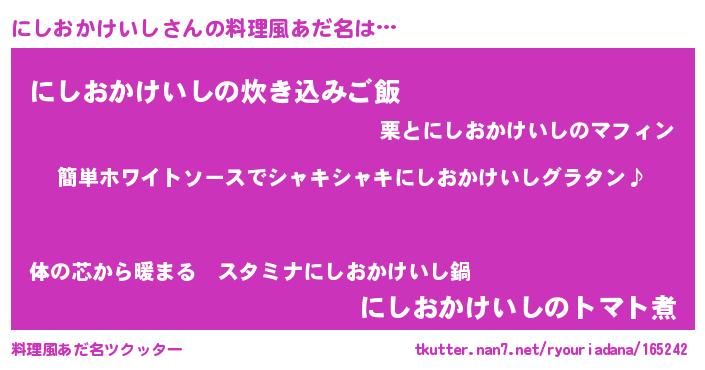 | 男性向けラノベタイトル風あだ名 | 『にしおかけいしの嫁は女の子じゃないと思った?』 |