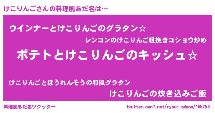| 女子向けラノベタイトル風あだ名 | 『けこりんごの卵を拾いまして』 |