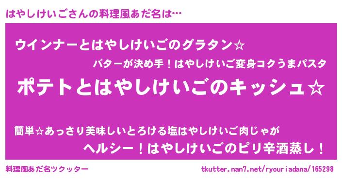| 胡散臭い通販商品みたいなあだ名 | 『伝統あるサプリメント…その名も「はやしけいご」』 |