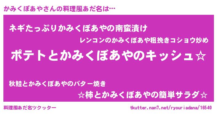 | 男性向けラノベタイトル風あだ名 | 『かみくぼあやの嫁は女の子じゃないと思った?』 |