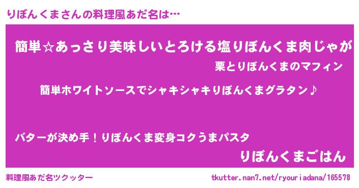 | 男性向けラノベタイトル風あだ名 | 『りぼんくまの嫁は女の子じゃないと思った?』 |