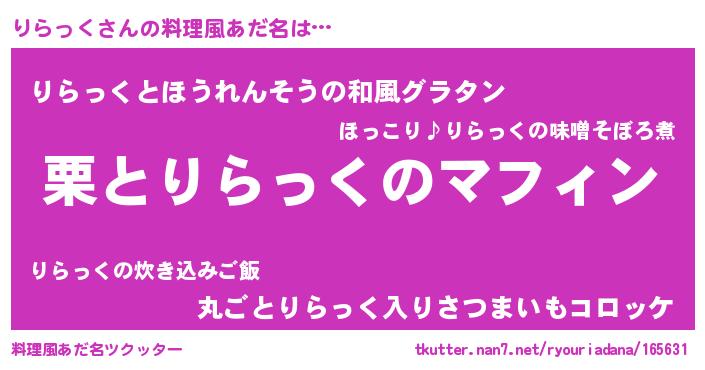 | 意味不明あだ名 | 『めかぶ科りらっく属』『自称りらっく』 |