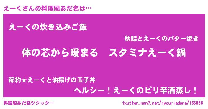 | 女子向けラノベタイトル風あだ名 | 『えーくの雑貨屋さん』『闇のえーく』 |
