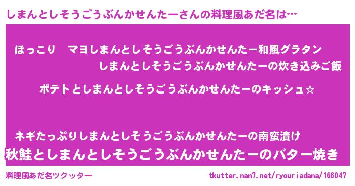 | 女子向けラノベタイトル風あだ名 | 『しまんとしそうごうぶんかせんたーの卵を拾いまして』 |