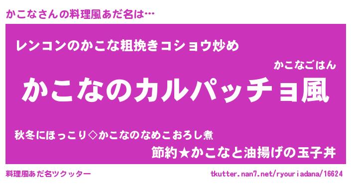 | 男性向けラノベタイトル風あだ名 | 『魔弾の王とかこな』『かこなの憂鬱』 |