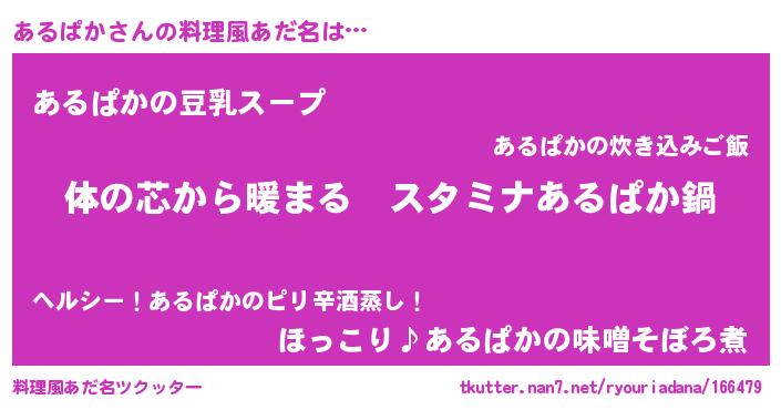 | 女子向けラノベタイトル風あだ名 | 『あるぱかの雑貨屋さん』『闇のあるぱか』 |