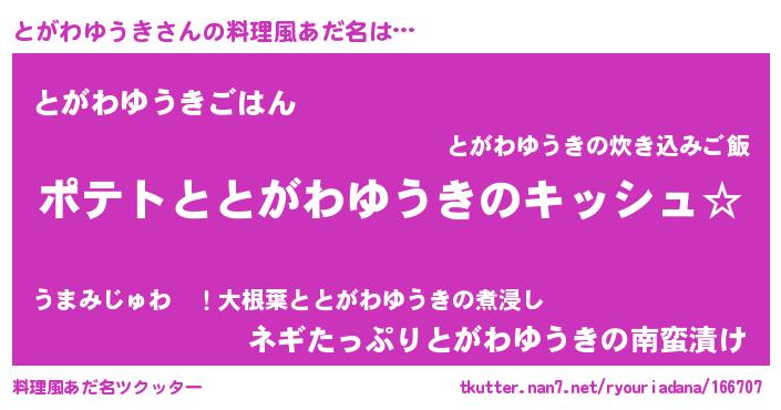 | 女子向けラノベタイトル風あだ名 | 『とがわゆうきの卵を拾いまして』 |