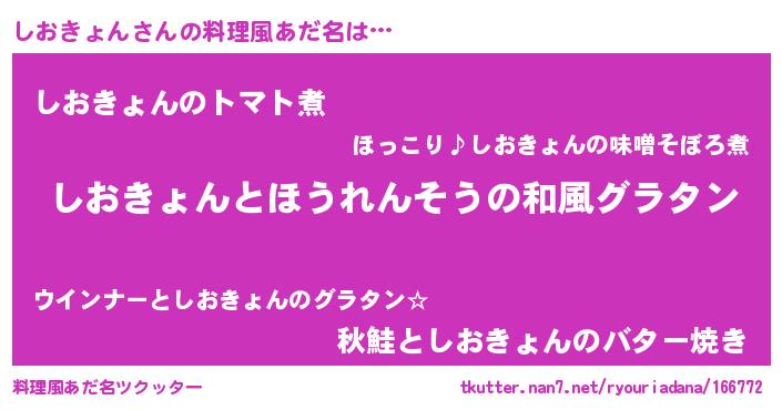 | ヒーロー風カッコイイあだ名 | 『慈愛の使者しおきょん』『銀牙騎士シオ』 |