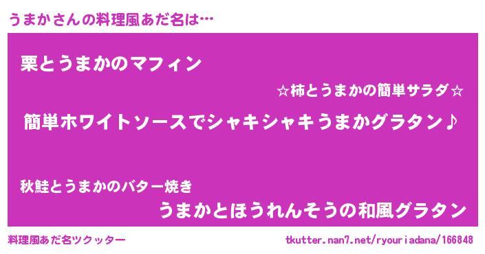| 女子向けラノベタイトル風あだ名 | 『うまか様がみてる』『うまかの契約王妃』 |