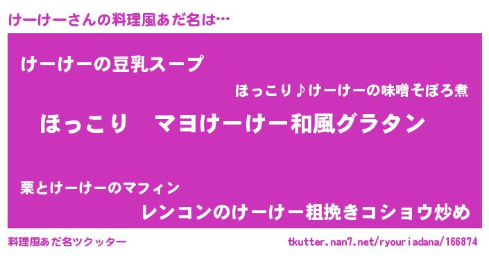| 男性向けラノベタイトル風あだ名 | 『この素晴らしい世界にけーけーを!』 |