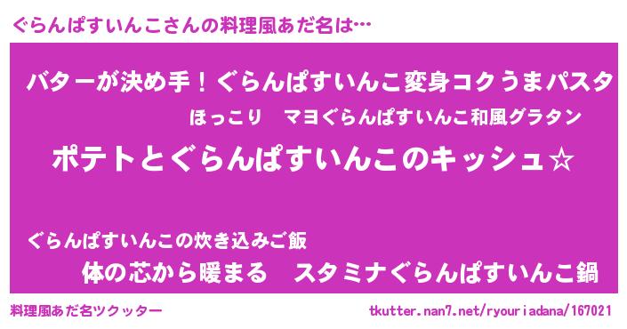 | 女子向けラノベタイトル風あだ名 | 『ぐらんぱすいんこの卵を拾いまして』 |