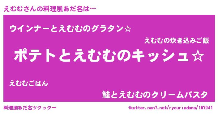 | 男性向けラノベタイトル風あだ名 | 『えむむの嫁は女の子じゃないと思った?』 |