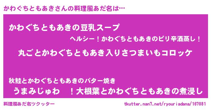 | ポケモン風あだ名 | 『カーワイ』『ヒカワグチトモアキ』 |