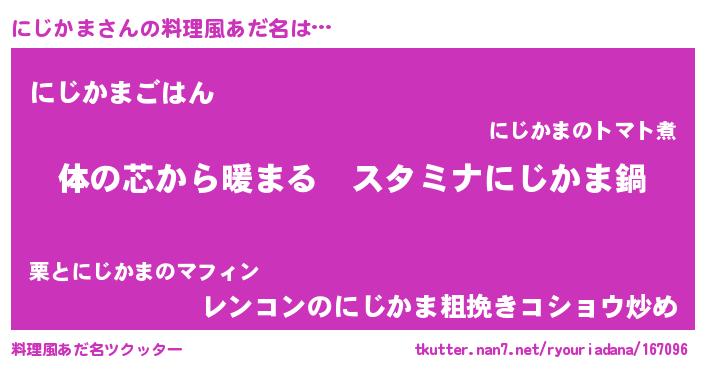 | ヒーロー風カッコイイあだ名 | 『ウルトラにじかまマン』『銀牙騎士ニジ』 |