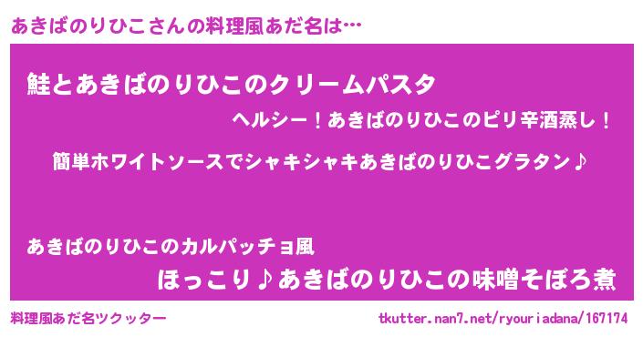 | 女子向けラノベタイトル風あだ名 | 『あきばのりひこ様がみてる』 |