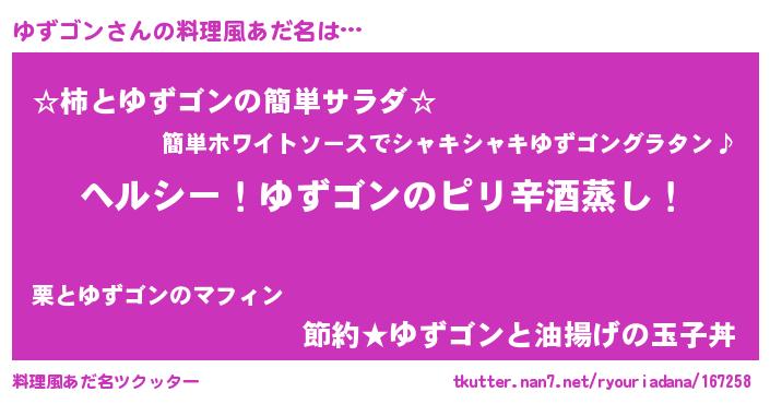 | 男性向けラノベタイトル風あだ名 | 『Re:ゆずゴンから始める異世界生活』 |