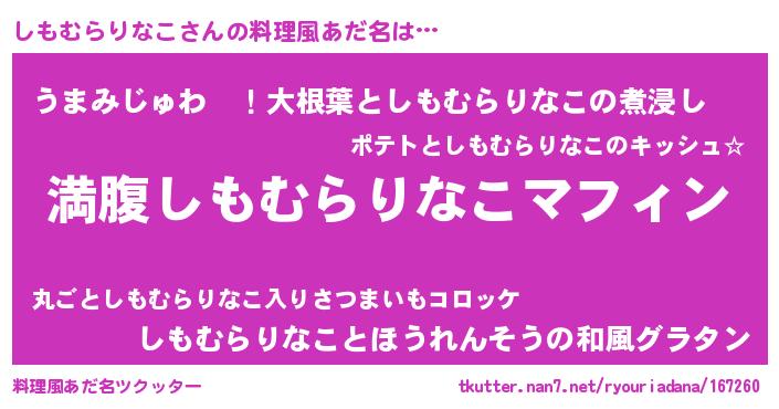 | ヘコむあだ名 | 『しもむらりなこ(小並感)』『なまこ酢』 |