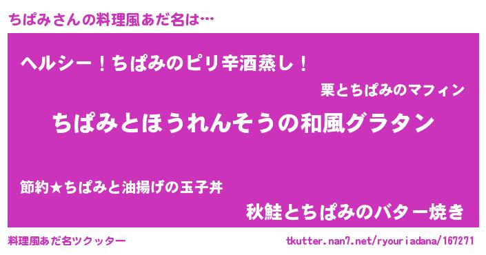 | 意味不明あだ名 | 『なめこ科ちぱみ属』『自称ちぱみ』 |