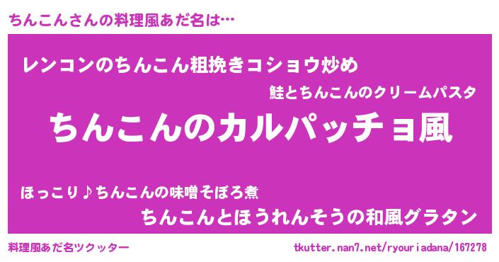 | 男性向けラノベタイトル風あだ名 | 『魔弾の王とちんこん』『ちんこんの憂鬱』 |