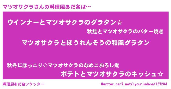 | 男性向けラノベタイトル風あだ名 | 『マツオサクラ~年齢イコール彼女いない歴の魔法使い~』 |