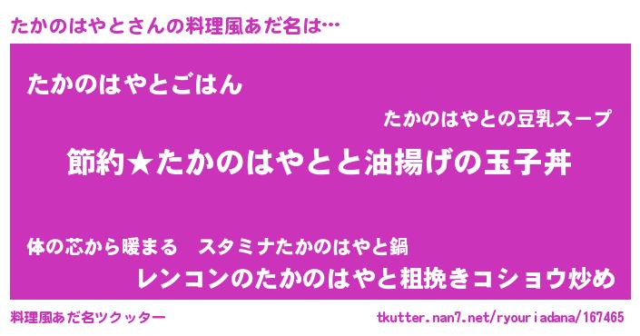 | 男性向けラノベタイトル風あだ名 | 『タカノハヤトアートオンライン』 |