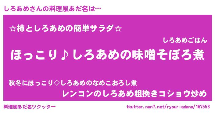 | 意味不明あだ名 | 『ペロリンしろあめ』『自称しろあめ』 |
