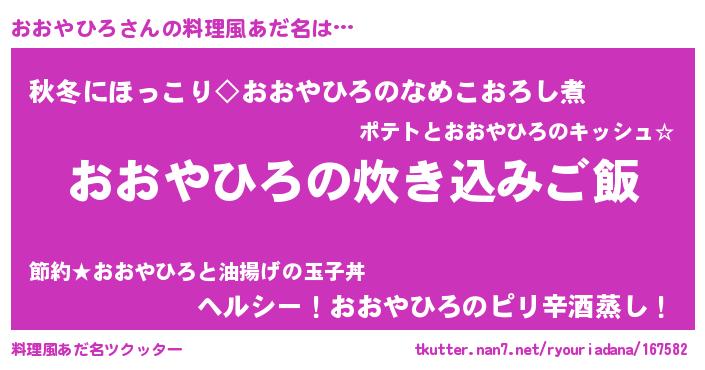 | 意味不明あだ名 | 『自称おおやひろ』『ペロリンおおやひろ』 |